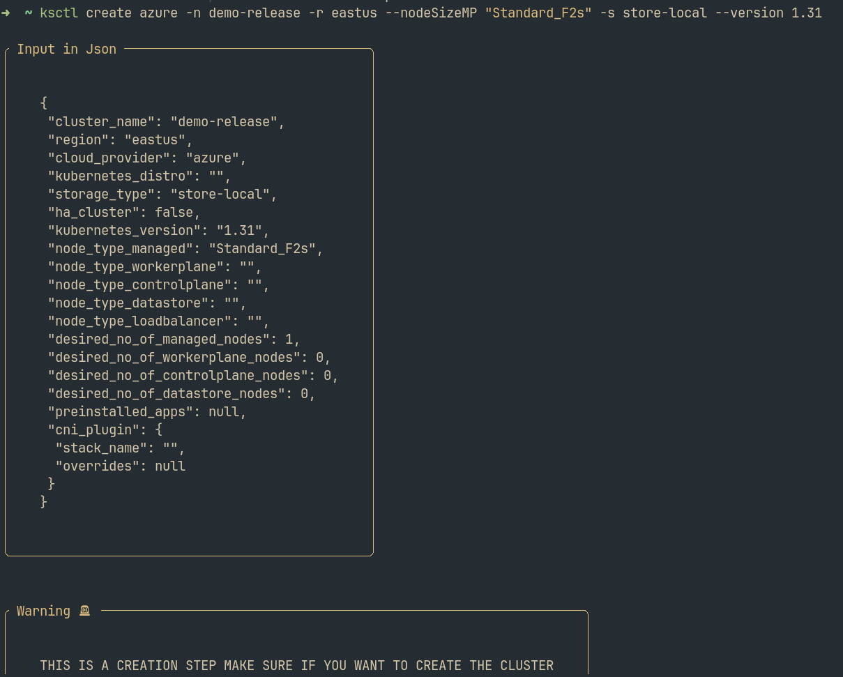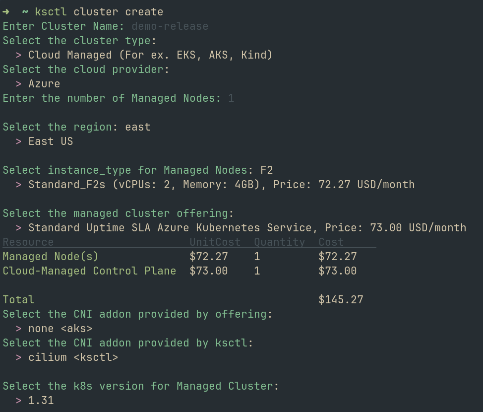 Before you need to remember what exactly is the vm_type, region sku, version, .. etc. Now you just need to specify the cloud provider and the rest will be taken care by ksctl. just choosing from the select options, It also shows the cost of instance_type with the block storage. A great step towards making the tool more user-friendly. 🎉